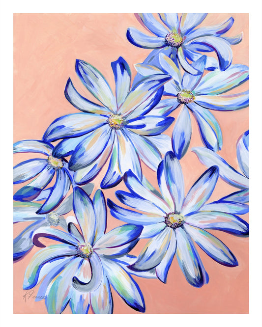 Blue daisies on peach -Giclee print on archival paper - Several sizes are available- unframed and framed